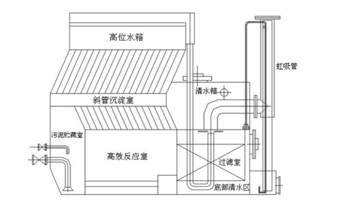 二、工艺说明 1、凝聚反应区: 经加药混合后的原水进入一体化净水器,首先进入装置底部的配水区,净水器的进水为底部配水区进水,穿孔管布水,确保设备布水均匀,并且每个微孔处水流以一定的流速喷出,使絮状污泥与原水中的细小矾花充分接触, 前级混合后的原水在污泥的吸附作用下,进行彻底的混凝反应,通过剩余污泥的循环回流,进行絮凝反应,使进水与污泥具有更大的接触面积,提高污泥的凝聚效率,使原水中的小矾花凝聚成较大的矾花,为斜管沉降创造有利条件。 2、斜管沉淀区: 沉降区分为上下两部分,通过改变上下两层的斜管的孔径,提高水力梯度值,依据浅层沉淀理论,设置了斜管加速沉降,下部反应区快速形成的大颗粒状絮体,在两层斜管之间水流方向发生改变,将会增加小颗粒絮体间的接触机会,在流经上层斜管时,进一步提高出水水质。形成的絮状体悬浮物在一层斜管区进行整流,一层斜管起均匀布水及导流作用,经充分反应后絮状水体沿二层斜管倾斜方向往上流动,进入沉降区内进行固液分离,沉积下来的污泥在重力及水流推力的作用下,沿斜管倾斜方向往下滑落。 3、污泥区: 斜管沉淀区沉淀的污泥通过水力的推流及自然沉降,部分经水力推动进入污泥区,部分污泥回流进入高浓度混合反应区,为保证污泥区排泥的彻底性,每套净水器污泥区均设有电动排泥系统及辅助排泥装置。 4、排泥系统: 每套净水器排泥系统由2套电动排泥阀组成,排泥管采用穿孔管结构,沿污泥区底部设置,用于排泥时污泥区的搅动,以利于污泥的彻底排净。系统排泥按设定的时间程序进行,每周期每格污泥区排泥1-3min(排泥时间可调)。 5、集水及滤池配水区: 在沉淀池的清水区采用可调式三角堰板集水,汇入集水槽,使系统集水均匀。斜管区集水槽设有2套配水管,分别进入2个滤池内,每个滤池的进水配有进水手动调节阀,可对每个滤池进水流量进行手动调节及设定。 6、过滤系统: 经沉淀后的水体由配水槽通过配水管分配进入各个过滤室内,通过U形水封器配水,并由上而下通过滤料层,滤后水由滤池内的连通管在重力作用下至滤室顶部的清水室。清水室出水通过重力自流进入后级净化水池。 7、滤池虹吸反冲洗系统: 每个滤室均配有1套虹吸反冲洗系统,过滤系统的反冲洗排水通过重力虹吸原理,通过设定的水头损失值形成虹吸,利用过滤室清水室内的洁净水及滤后水自动进行反冲洗,过滤层反冲洗水接至水封槽,管管网进入调节池。 斜管沉淀区出水经滤料层过滤一定时间后,由于滤料层的运行阻力逐渐增大,虹吸上升管内水位逐渐升高,当水位上升至虹吸辅助管位置时,虹吸管内空气随着虹吸辅助管排水,形成负压,将虹吸管内空气不断带走,最终使虹吸上升管及虹吸下降管内的水位接通,即形成虹吸,过滤室上室清水在清水层的静压及真空吸引下迅速反冲洗,装置内清水按照正常运行路径反方向返回,当清水经过滤料层时即开始对滤料进行反冲洗,滤室的反洗强度通过排水管管口的锥形调节板来调整,设定反洗强度及反洗时间,每次反冲洗历时4~6分钟。 该净水器设备从反应、絮凝沉淀、集水、配水、过滤、体内反洗、排泥等一系列运行程序,均为全自动运行。