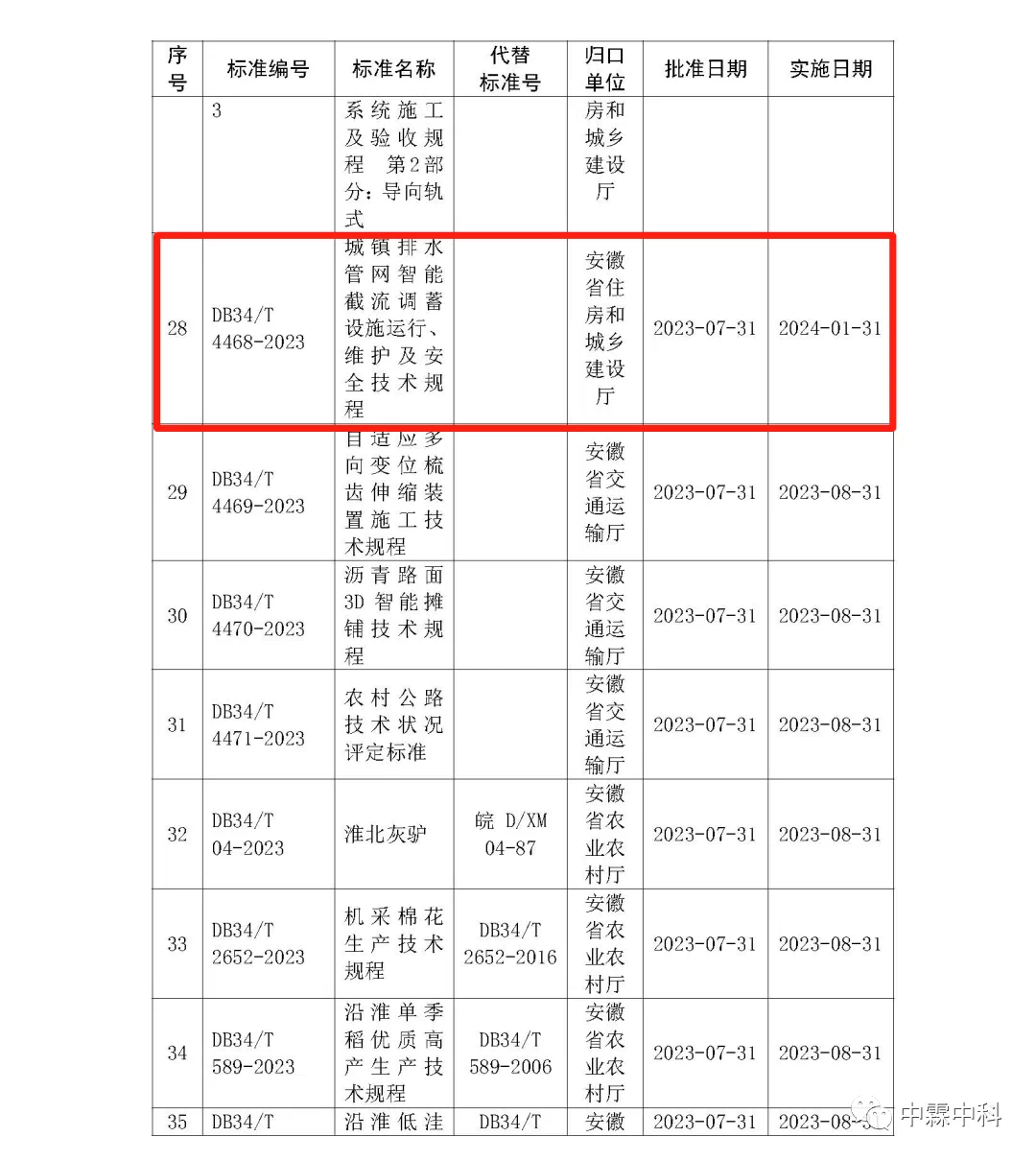 喜报!中霖中科主编的一项安徽省地方标准获批发布!2023年7月31日,中霖中科主编的安徽省《城镇排水管网智能截流调蓄设施运行、维护及安全技术规程》DB34/T4468-2023,由安徽省市场监督管理局正式发布,2024年1月31日正式实施!
