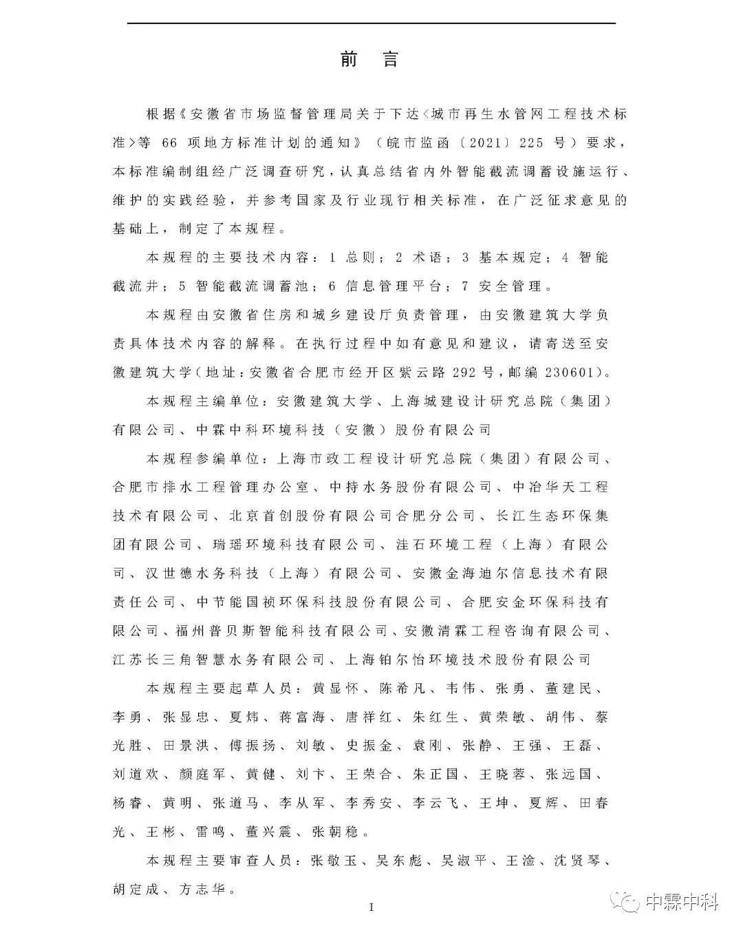 2021年3月中霖中科环境科技(安徽)股份有限公司联合安徽建筑大学、上海城建设计研究总院(集团)有限公司主编立项的安徽省《城镇排水管网智能截流调蓄设施运行、维护及安全技术规程》(DB34/T4468-2023)经安徽省住建厅批准,历时近3年,标准编制小组调研了北京市、上海市、合肥市、芜湖市、马鞍山市、六安市等地负责的管理、建设、勘测、设计、运营的共18家单位反馈了意见,经专家组多次评审,收集分析相关资料,最终形成标准正式文稿。 共同构筑城市排水安全生命线 中霖中科作为主编单位全程参与了这项技术标准制定工作。通过对草案编制、征求意见、技术评审等多环节的严格把控,该项技术标准的发布,彰显了我司技术实力和责任担当,规范了安徽省城镇排水管网智能截流调蓄设施运行维护及管理工作,为城镇排水管网智能化设施安全、稳定、高效运行提供了管理依据,弥补了安徽省城镇排水管网智能化领域技术管理及运维的空白。 引领行业发展方向 推动技术进步和产业升级 长期以来,中霖中科依托中科院及国家高新技术平台,高度重视科技创新工作,积极引领行业发展方向,务实且创新推动技术进步和产业升级。该项标准的制定既是安徽省行业主管部门对中霖中科专业领域的充分肯定,也为今后持续健康发展提供了更宽广的舞台。